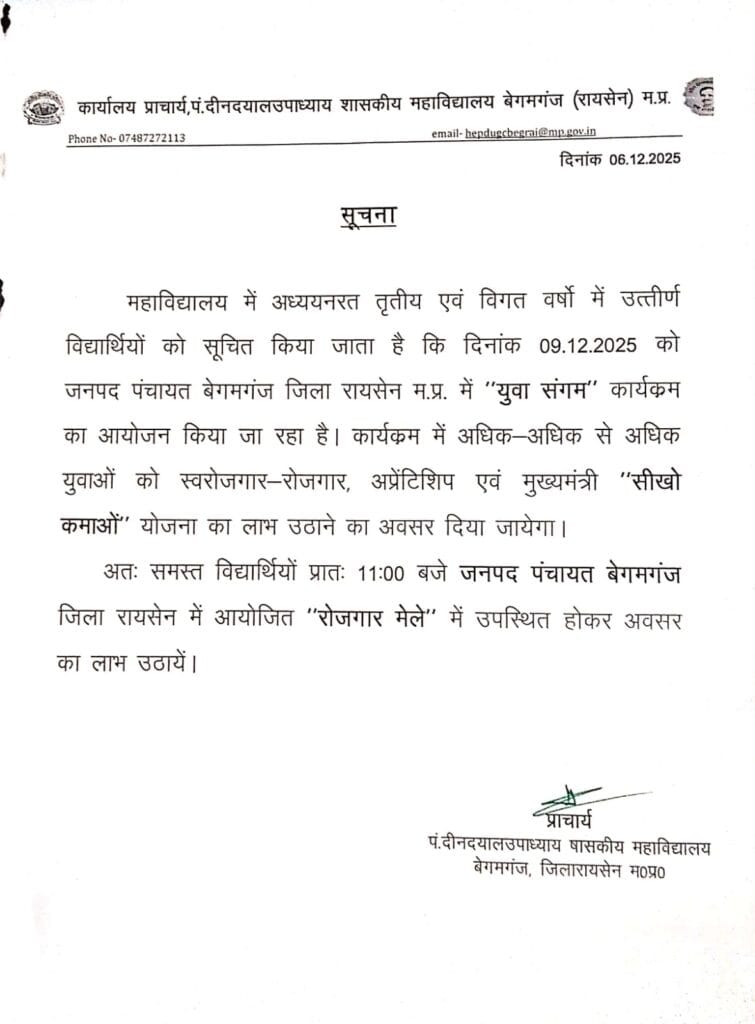 Author: Gazala PraveenPost navigationPreviousPrevious post:महाविद्यालय में NEP 2020 अध्यादेश 14 (1) एवं 14 (2), Swayam portal, Digilocker का प्रशिक्षण संपन्नNextNext post:BA/BSc/B.Com द्वितीय सीसीई परीक्षा समय सारणी 2025-26Related PostsBA/BSc/B.Com द्वितीय सीसीई परीक्षा समय सारणी 2025-26December 8, 2025महाविद्यालय में NEP 2020 अध्यादेश 14 (1) एवं 14 (2), Swayam portal, Digilocker का प्रशिक्षण संपन्नNovember 8, 2025BA/BSc/B.Com प्रथम वर्ष सीसीई परीक्षा संशोधित समय सारणी 2025-26November 8, 2025प्रेस विज्ञप्ति- महाविद्यालय में दिनांक 01 से 03 नवंबर 2025 तक मध्य प्रदेश स्थापना दिवस समारोह के अंतर्गत विभिन्न कार्यक्रम आयोजित किए गए।November 6, 2025BA/BSc/B.Com प्रथम वर्ष सीसीई परीक्षा समय सारणी 2025-26November 4, 2025महाविद्यालय में भारतीय संस्कृति ज्ञान परीक्षा का आयोजन।दिनांक- 21/11/2025November 3, 2025