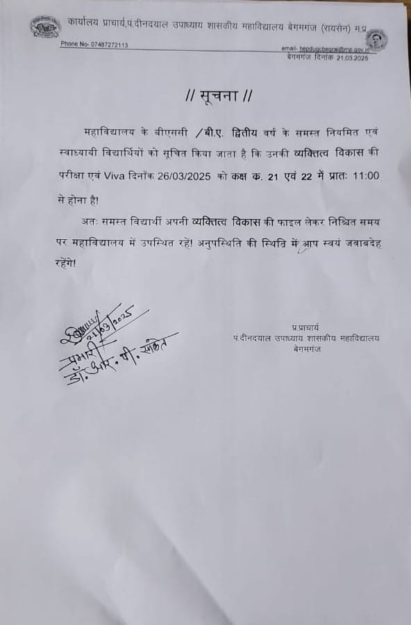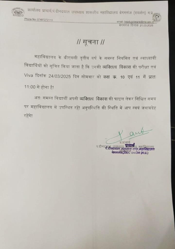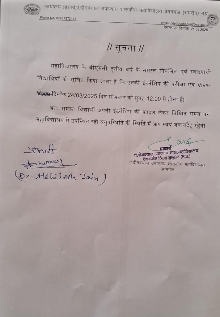 Author: Gazala PraveenPost navigationPreviousPrevious post:प्रधानमंत्री इंटरशीप योजना के अंर्तगत महाविद्यालय में आयोजित कैंप।NextNext post:Revised Time Table for NEP 1-2-3 Year exam-2025Related Postsमहाविद्यालय में NEP 2020 अध्यादेश 14 (1) एवं 14 (2), Swayam portal, Digilocker का प्रशिक्षण संपन्नNovember 8, 2025BA/BSc/B.Com प्रथम वर्ष सीसीई परीक्षा संशोधित समय सारणी 2025-26November 8, 2025प्रेस विज्ञप्ति- महाविद्यालय में दिनांक 01 से 03 नवंबर 2025 तक मध्य प्रदेश स्थापना दिवस समारोह के अंतर्गत विभिन्न कार्यक्रम आयोजित किए गए।November 6, 2025BA/BSc/B.Com प्रथम वर्ष सीसीई परीक्षा समय सारणी 2025-26November 4, 2025महाविद्यालय में भारतीय संस्कृति ज्ञान परीक्षा का आयोजन।दिनांक- 21/11/2025November 3, 2025प्रेस विज्ञप्ति – मध्य प्रदेश के विकास पर्यटन एवं सांस्कृतिक महत्व के स्थलों पर आधारित चित्रकला प्रतियोगिताNovember 3, 2025